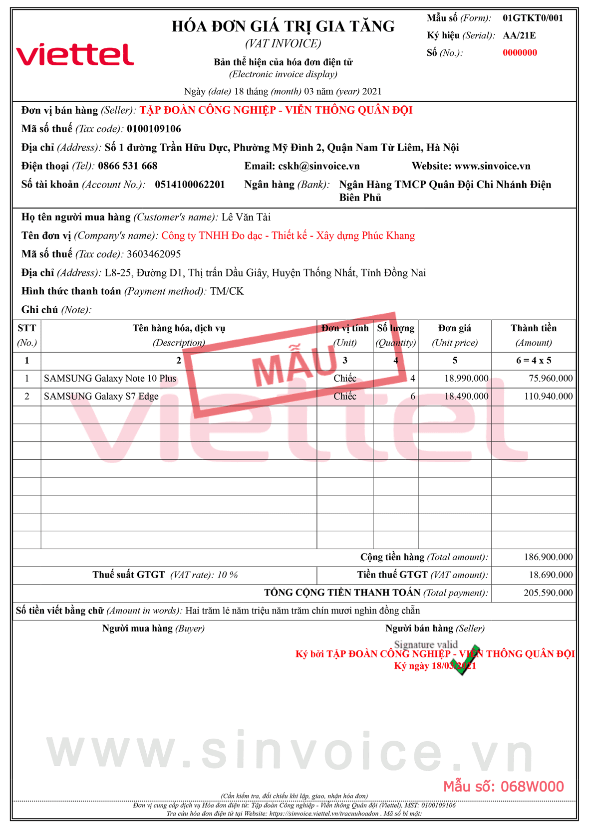 | Miễn phí | Khách hàng chọn mẫu hóa đơn điện tử trong danh sách mẫu hóa đơn miễn phí của Viettel đã thiết lập theo đúng quy định. Không hỗ trợ chỉnh sửa, thay đổi trường thông tin. Không thay đổi màu sắc, size chữ. Tham khảo danh sách mẫu miễn phí ngay bên dưới! |